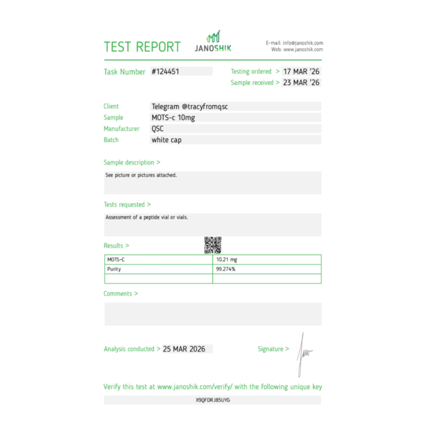 Peptyd MOTS-C w postaci liofilizatu w ilości 10mg na fiolkę.